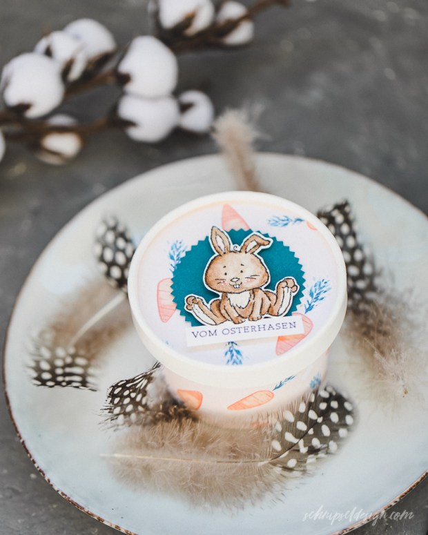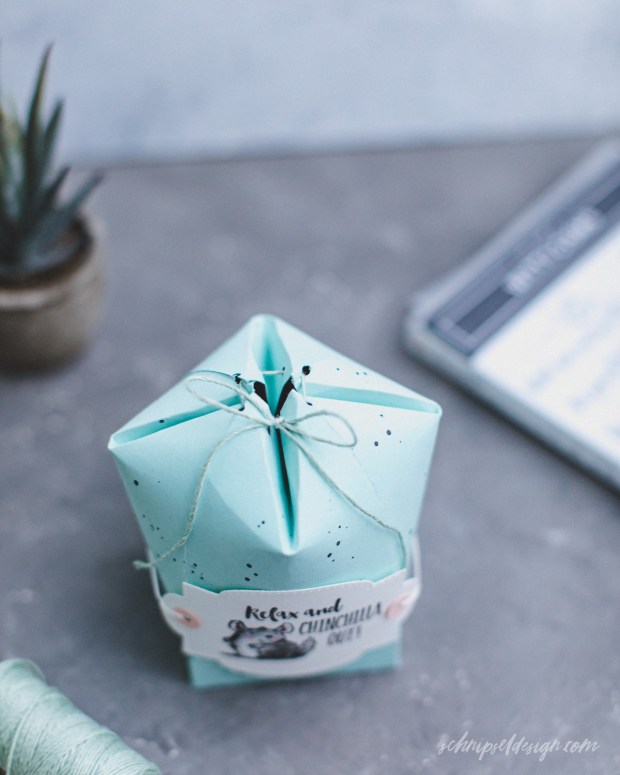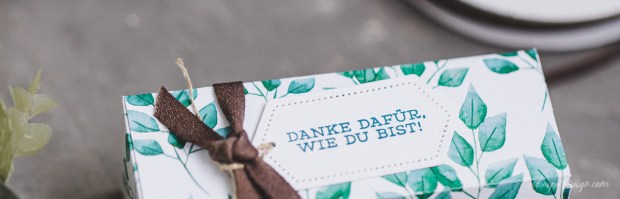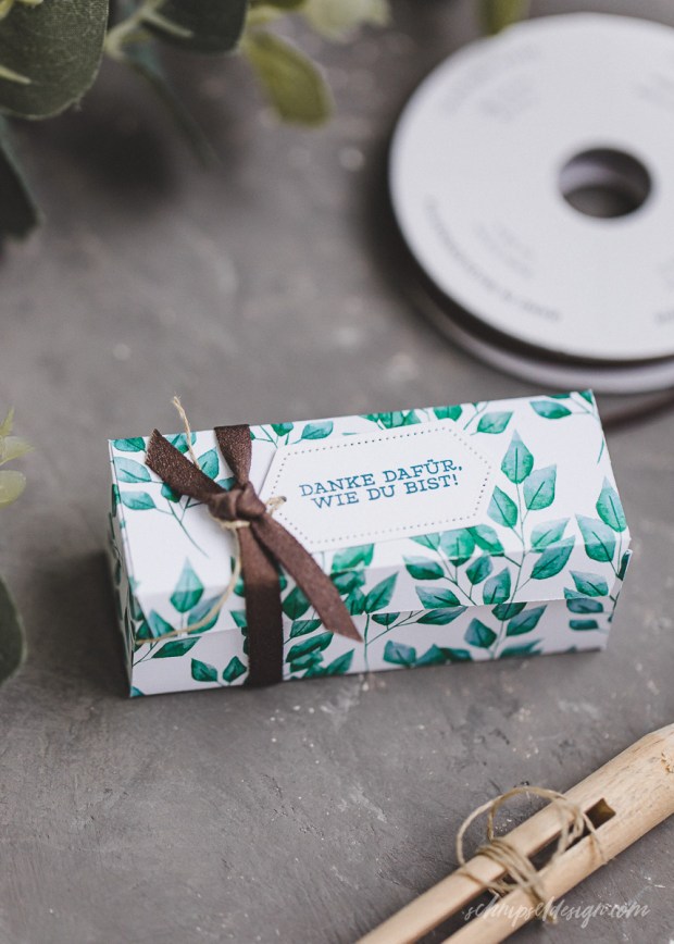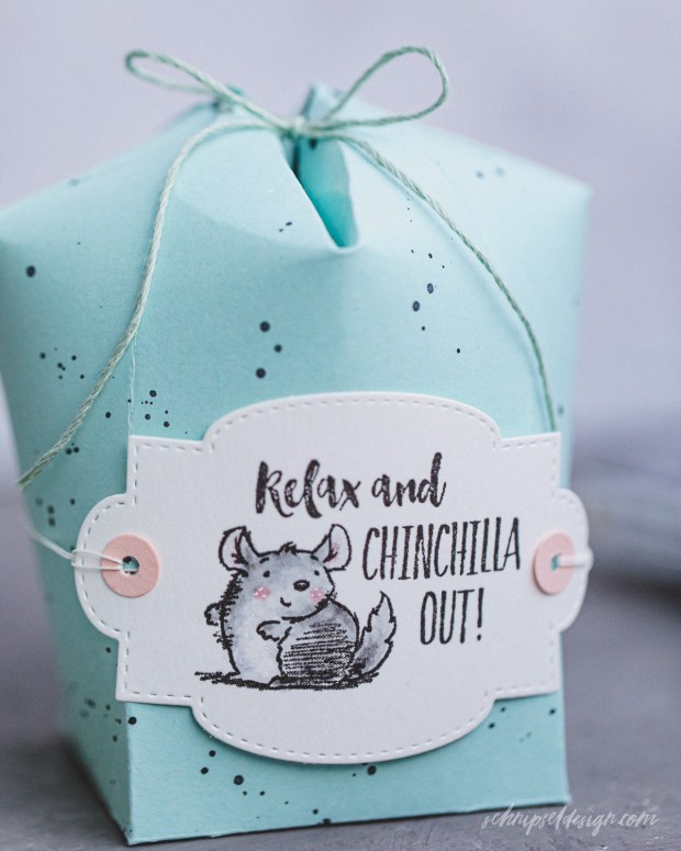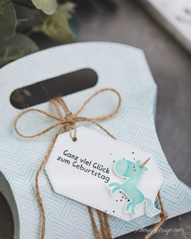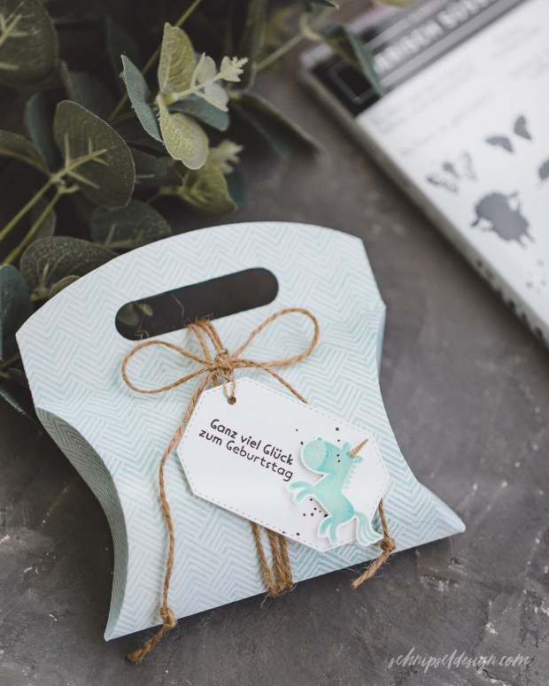 Tierisch süße Grüße, definitiv unter meinen Favoriten im neuen Katalog. Geworden ist es eine Pillowbox mit Henkel (aus dem Silhouette-Store – dieses Design) – geschnitten und gefalzt mit dem Cricut Maker. Ganz schlicht gibt’s den Anhänger dazu. Das tolle Etikett ist im passenden Stanzenset (Tierische Freunde) mit dabei.