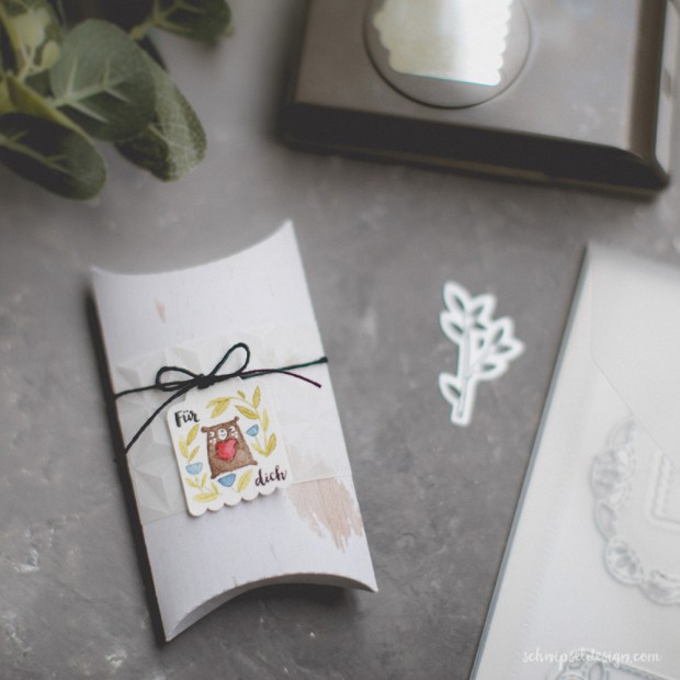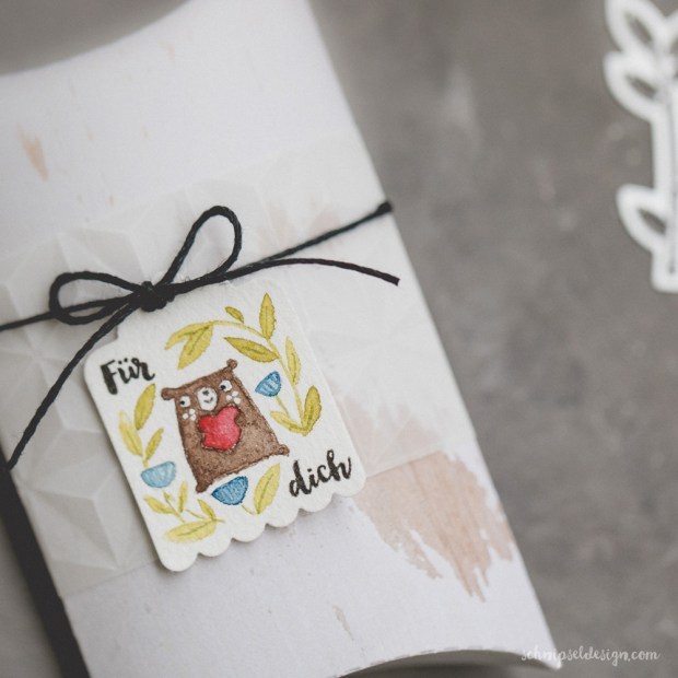 Ich hab etwas getüfftelt und geworden ist es diese Box die ganz ohne Kleber auskommt. In ganz schlicht kraftfarben mit Details in Flüsterweiß und Kupfer. Das Etikett sowie der Spruch ist aus dem Produktpaket Friedvolle Zweige. Beim Zweig hab ich mich dann für einen aus einem anderen Set entschieden – den schönen Mistelzweig aus den Stanzformen Adventsakzente. Ja, sie ist schlicht, aber mir gefällt sie so sehr gut ❤