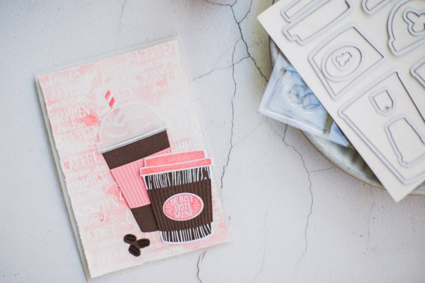 Ein kleines Kärtchen – mit einer Basis aus Transparentpapier und einem embossten/aquarellierten Hintergrund. Farbkombi: Espresso meets Flamingorot. Macht sich sicherlich gut, wenn man mal einen Starbucks-Gutschein verschenken will (warte ja noch immer drauf, dass mal einer nach Linz kommt *hiertraurigensmileyeinfügen*)