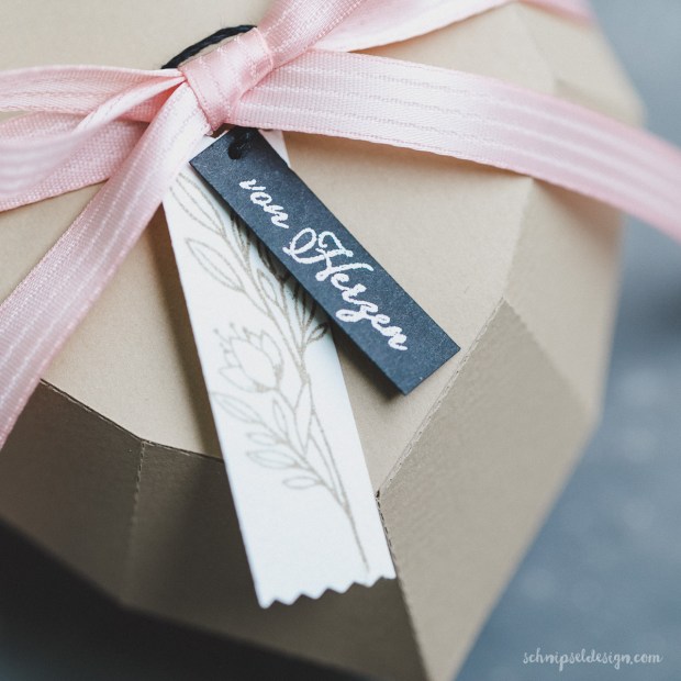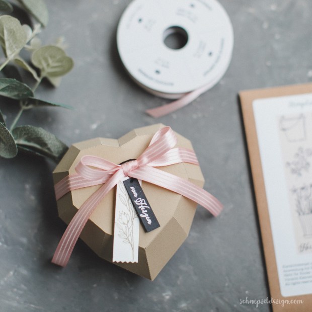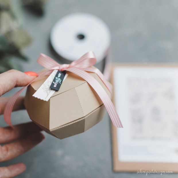 Es gibt unterschiedliche Varianten der Box – ich hab mich für die Doppelte mit Boden und Deckel entschieden. Es ist zwar etwas ein Gefummle, aber mir gefällt sie sehr gut. Der Kraft-Farbkarton ist ein Favorit zu dem ich gern greife. Verschlossen ist die Box zum einen im Inneren mit zwei Magnetverschlüssen und zum anderen mit einem Kirschblütenfarbenen Geschenkband.