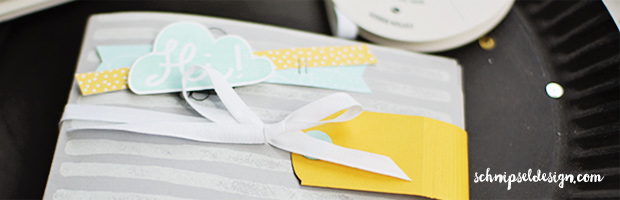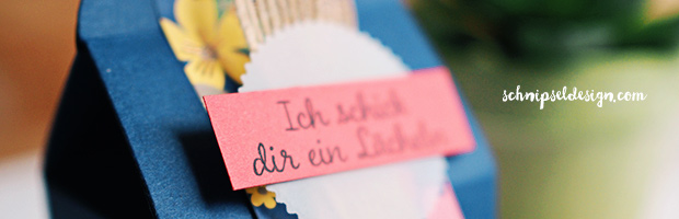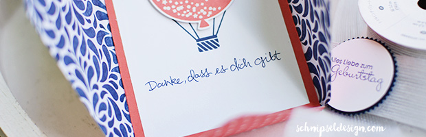 Pfirsich Pur und Jeansblau – passt schön zusammen wie ich finde (falls du übrigens Insprationen zur Farbwahl brauchst – ich hab ein Pinterest-Board dazu). Gestempelt wurde mit dem Stempelset Perfekt verpackt.