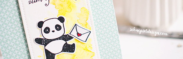 Als Basis hab ich extrastarken flüsterweißen Farbkarton verwendet – darauf ein Design aus dem Designerpapier-Block Meine Party. Der Tag ist aus Aquarallpapier ausgestanzt und anschließend mit Wasserfarben gemalt. Der süße Panda ist von Mama Elephant („Pandamonium“) und der Spruch kommt aus dem Stempelset Partyballoons (die Schrift find ich einfach sooooo schön). Noch etwas Kordel und ein Akzente in Brilliantweiß … und fertig.