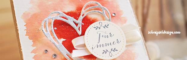 Als Variante 1 ein kleineres quadratisches Kärtchen mit Aquarell-Hintergrund. Das Herz kommt aus dem Thinlits Set Grüße voller Sonnenschein – der Spruch aus dem Stempelset Für immer.