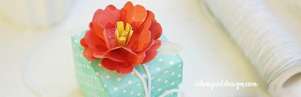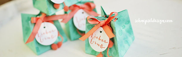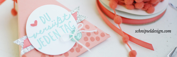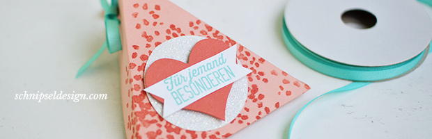Mein Beitrag für den Blog Hop – eine Dreiecksverpackung. Hauptsächlich gewerkelt mit Produkten aus der Sale-A-Bration (Stempelset Tag der Tage, Zubehörpaket Die schönste Zeit) und einem Produkt aus dem Frühjahr/Sommerkatalog (Bommelband in Calypso).