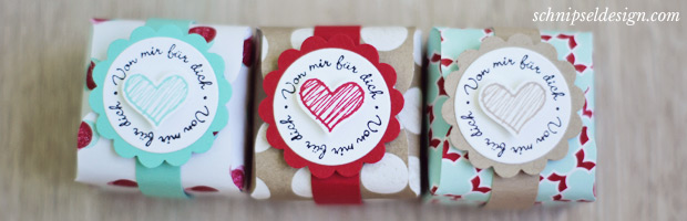 Als Nervennahrung gab’s noch Mentos, ein paar Oreo Kekse und Mikrowellen-Popcorn mit ins Glas rein. Der kleine Anhänger bzw. die Umrandung davon ist mit einem Stempel aus dem Stempelset „Ein Gruß für alle Fälle“ mit schwarzer StazOn-Tinte gestempelt und mit einem Stück Kordel an der Schleife befestigt worden.