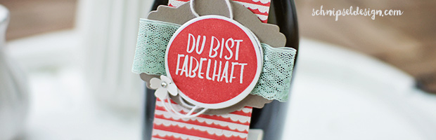 Der Spruch sowie das heißgeprägte (embosste) Muster in Weiß sind aus dem Stempelset Du bist fabelhaft. Für den Flaschenhals habe ich einfach mit unterschiedlich großen Stanzen gearbeitet.