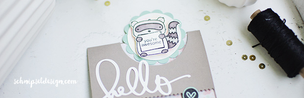 Der supersüße Waschbär (und die Katze die innen klebt) sind aus einem Stempelset von Mama Elephant (Three Amigos). Beide ausgemalt mit meinem Aquarellfarben von Schmincke. Das gemusterte Papier ist von Crate (Kiss Kiss Collection) – passte farblich einfach toll dazu.