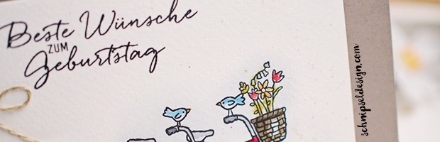 Gut, das Tandem aus dem Stempelset Gemeinsam stark hat mich nicht von Anfang an umgehauen, als ich es im Ergänzungsfolder zur Sale-A-Bration zum ersten Mal gesehen habe. Räder und ich … ich weiß auch nicht, wir haben nie zu einander gefunden. Liegt vermutlich daran, dass ich auf einem Berg aufgewachsen bin und da war Radfahren nie so richtig lustig, weil irgendwie musste man ja auch wieder heimkommen und 300 Höhenmeter strampelt man halt nicht einfach so. Aber dann war es da, das Stempelset. Ich hab damit gespielt und jetzt find es toll. Vor allem die kleinen Piepmatze ❤ die sich hier über die Lenkstangen hinweg anhimmeln. Die werd ich sicher noch öfter wo rein setzten.